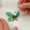 A két üresen maradt sarokba ragasszunk jellegzetes karácsonyi motívumokat szalvétából. Vágjuk körbe a mintát, és húzzuk le a felső rétegét. Speciális, textilre alkalmazható dekupázsragasztóval kenjük be a helyét az anyagon, helyezzük rá, majd kenjük át még egyszer a felületét. Miután megszáradt, vasaljuk három percig az anyag hátoldaláról. Bélyeg gyanánt ragasszunk egy cakkos szélűre vágott kis négyzetet a kivarrt képeslap jobb felső sarkába.