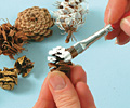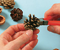 A nagyobb tobozokat csípjük félbe, hogy később, mikor felragasztjuk őket, ne emelkedjenek ki a koszorúból. A diókat feszítsük szét, felezzük el, és vegyük ki belőlük a dióbelet. A terméseket válogassuk négy kisebb-nagyobb csoportba úgy, hogy mindben legyen az összes termésből.