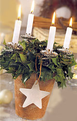 Ha a formabontó megoldások hívei vagyunk, akkor a szokványos koszorúalapot helyettesítsük hagyományos agyag virágcseréppel. A fenyő, magyal vagy egyéb örökzöld ágakból összekötözött és drótvázra erősített koszorút helyezzük fel a cserépedény tetejére. Végül csippentsük az ágakra a négy kisebb méretű gyertyatartót.