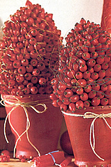 Ennek a melegséget sugárzó asztali dísznek az elkészítéséhez szükséges kellékeket könnyedén beszerezhetjük – gyűjtögessünk össze kellő mennyiségű csipkebogyót vagy egyéb színes erdei bogyót (berkenyét, magyalt, esetleg tűztövist). Szükségünk lesz még egy kiszuperált virágcserépre – de bármilyen virágtartó alkalmas , gombostűkre vagy ragasztópisztolyra, valamint tűzőhabra. Ez utóbbi beszerezhető a hobbiboltokban. Első lépésként a tűzőhabot helyezzük bele a cserépbe, majd gombostű vagy ragasztópisztoly segítségével borítsuk be a piros bogyókkal. Jó sűrűn helyezzük el őket, hogy ne maradjon ki fedetlen rész.