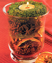 Az alapanyagok beszerzésénél ügyeljünk arra, hogy a koszorúnak bele kell férnie a pohárba. A kép szerint, rétegenként tegyünk a pohárba szegfűszeget, a narancskarikákat, az angyalhajat és a csillagánizst. Tegyük a tetejére a koszorút és helyezzük bele a mécsest.