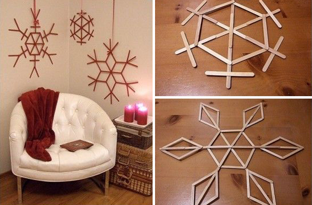 Hópelyhes gigadekorációt készíthetünk jégkrémes pálcikákból. Ragasszuk őket össze, fújjuk le pirosra vagy hófehérre, és akasszuk a falra!