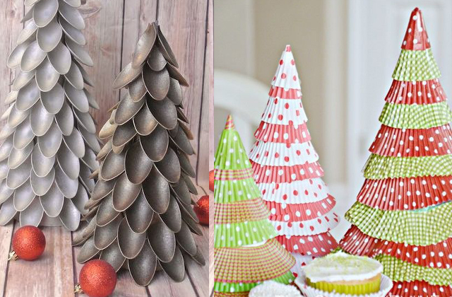 Kis karácsonyfák műanyag kanalakból vagy muffinpapírokból is készülhetnek.