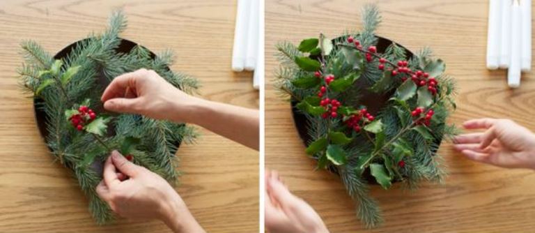 A percek alatt elkészíthető adventi koszorú első lépéseként a tálat érdemes elmosogatni használat előtt. Amikor teljesen megszáradt, körben helyezd el a nagyjából azonos méretűre vágott fenyőágakat. Díszítsd a fagyöngyökkel.