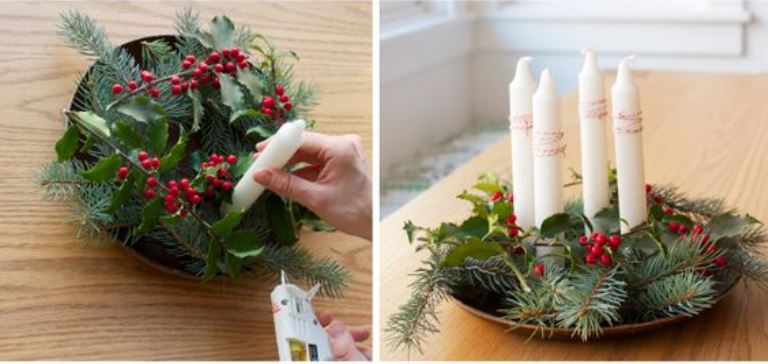 Igazítsd el szépen a gyertyákat is. Hogy megálljanak az adventi koszorúban, a ragasztópisztollyal rögzítsd őket az edény aljához.
