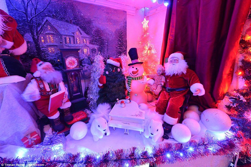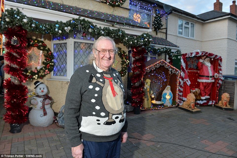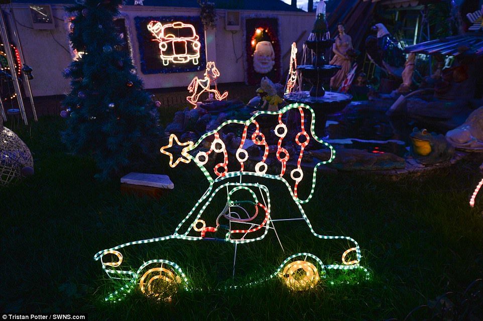 A 74 éves, idős pár már szeptemberben nekiállt a díszítésnek, amihez több mint 10 ezer dekoratív elemet használtak fel az egyszerű égőktől és girlandoktól kezdve a hatalmas hóemberekig, Télapókig és a kidolgozott, hatalmas betlehemig.