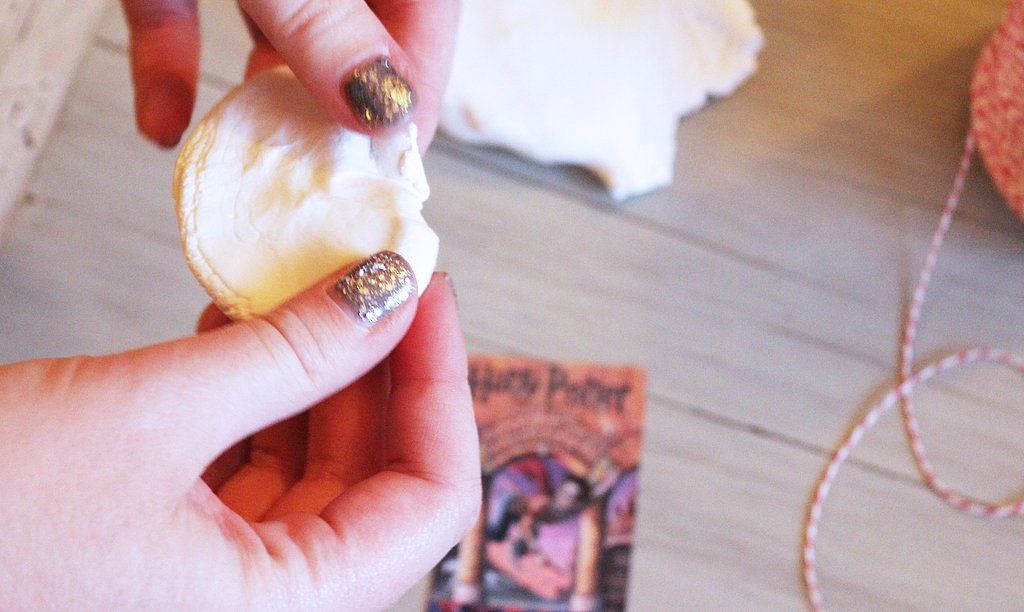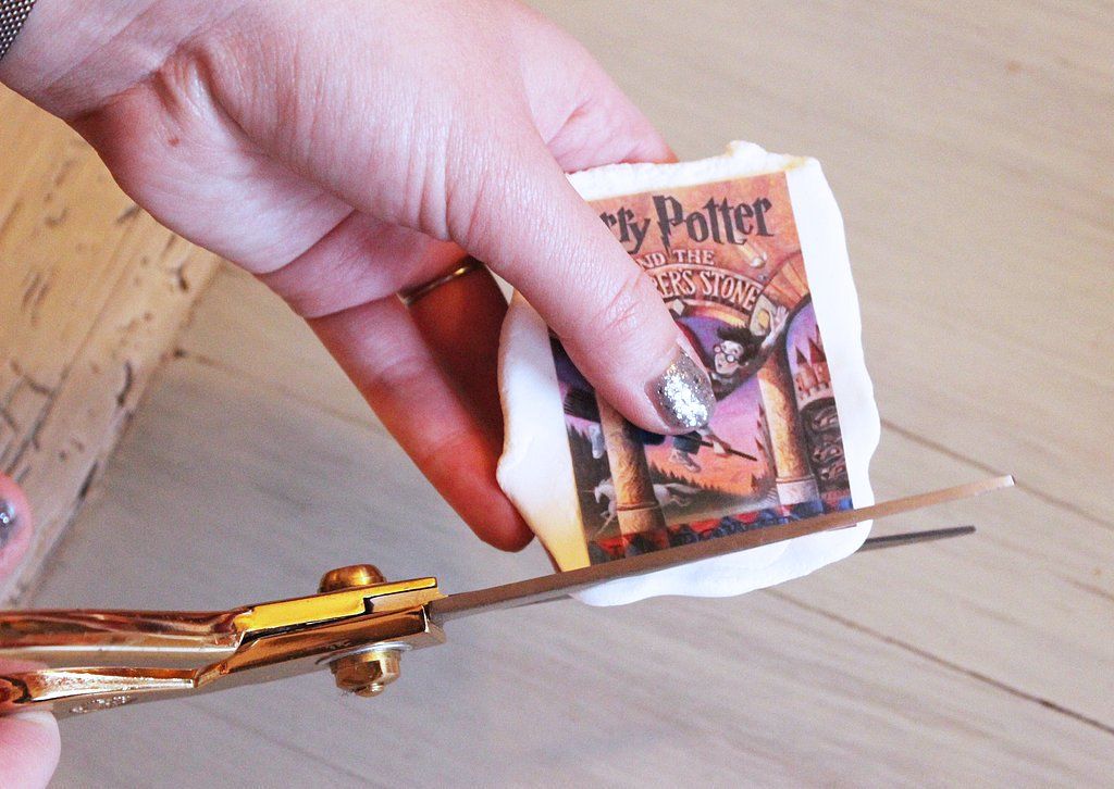 Nyomtasd ki a Harry Potter-könyborítókat a megfelelő méretben, és vágd ki őket. Vegyél egy darab gyurmát, majd lapítsd szét, mint egy palacsintát. Ügyelj arra, hogy nagyobb legyen, mint a könyvborító. Nyomkodd rá a borítót a gyurmára. Bár nem lesz rá valószínűleg szükség, de az extra biztonság érdekében ragasztópisztollyal is tehetsz rá pár pöttyöt.
