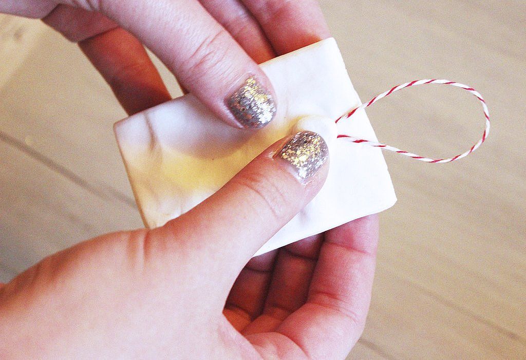 Vágj le a fonalból 5-7 centit, és hozz létre egy hurkot, majd egy kis darab gyurmával rögzítsd a felületen.