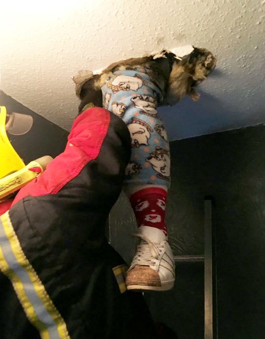A 30 éves nő épp a karácsonyi dekorációval bíbelődött, mikor beszakadt alatta a padló, és lógó lábbal beszorult a partnerével közös loftjuk két szintje közé. Hogy még zseniálisabb legyen a kép, a nő épp Szépség és a szörnyeteg mintás egyberészes pizsamában volt. Így nem csoda, hogy mikor párja, Nicki meglátta, hogy mi történt, azt tette, amit minden szerető partner tett volna: röhögőgörcsöt kapott és fotózott.
