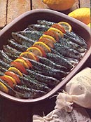 Tisztítsd meg a szardíniát, és ha kell, távolítsd el a fejét. Jól mosd és szárítsd meg. Egy nagy alpos tálba szépen rendezd el.