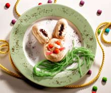 A krémet nyomózsákba töltjük, és 4 kávéporral megszórt tányérra 1-1 nyuszifejet formálunk. A füleket is a kávéporral dekoráljuk. A csokoládélencsékből vagy kávészemekből szemeket és szájat alakítunk ki, és ízlés szerint a cumival díszítjük. A desszertet legalább 1 órára a hűtőszekrénybe helyezzük.