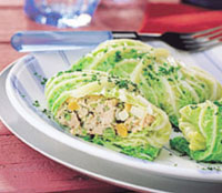 4. A zöldségeket, a húst, a zúzott fokhagymát, a tárkonyt, a petrezselymet, a snidlinget és a tojásokat összekeverjük, és sóval, borssal ízesítjük. A káposztákat a húsos krémmel megtöltjük, a széleket behajtjuk, és zsineggel átkötjük. A káposztákat vajjal kikent tepsibe tesszük. 1,5 dl főzővízzel meglocsoljuk, kétrétegű alufóliával befedjük, és forró sütőben megsütjük. Apróra vágott petrezselyemmel díszítve tálaljuk.