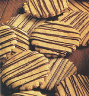 3. Az olvasztott csokoládét töltsd műanyag zacskóba, aminek egyik sarkából egy kicsit lecsípsz. Ebből a nyílásból vékony sugárban csíkozd be a kekszeket.