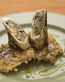 KÖRTÉVEL ÉS LIBAMÁJJAL TÖLTÖTT CSIRKEMELL TÓCSNIVAL