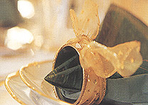 Ezen felül az is feldobja a terítést, ha a karácsonyi szalvétákat átkötjük egy szélesebb díszes szalaggal, s úgy helyezzük a tányér közepére vagy éppen mellé. Aztán ha még ennél is extravagánsabbak szeretnénk lenni, a szalag kötésébe tűzhetünk egy szál fagyöngyöt is, és mellétehetünk néhány aranyozott diót, mogyorót.