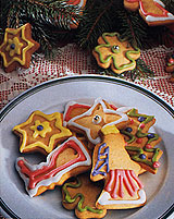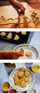 Kenőtoll vagy konyhai ecset segítségével festhetjük be a formákat. Vékony vonalakat úgy tudunk rajzolni, hogy zsírpapírból pici tölcséreket készítünk, beletöltjük a mázat, kicsípjük a végét, és már rajzolhatunk is vele. (Nem szükséges mindegyik figurát színes mázzal díszíteni, megtehetjük például, hogy sütés előtt mandulaszemeket rakunk a tetejükre.)