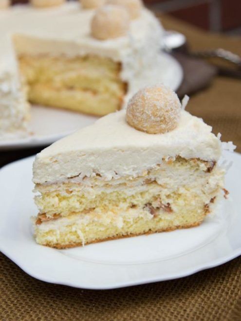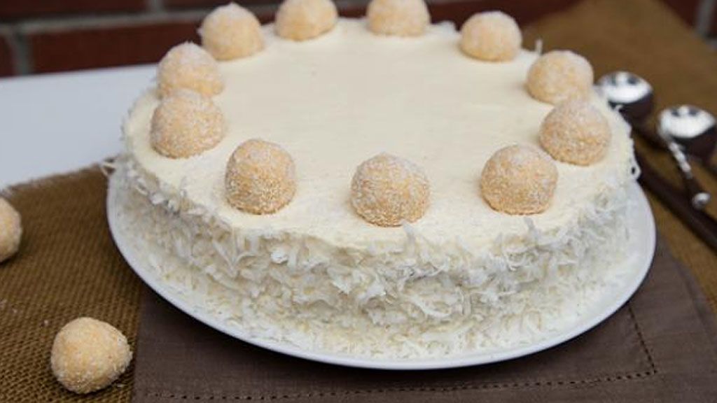 5. A tortát borítsuk meg a krémmel, és díszítsük kókuszchip-szel, illetve Raffello bonbonokkal!