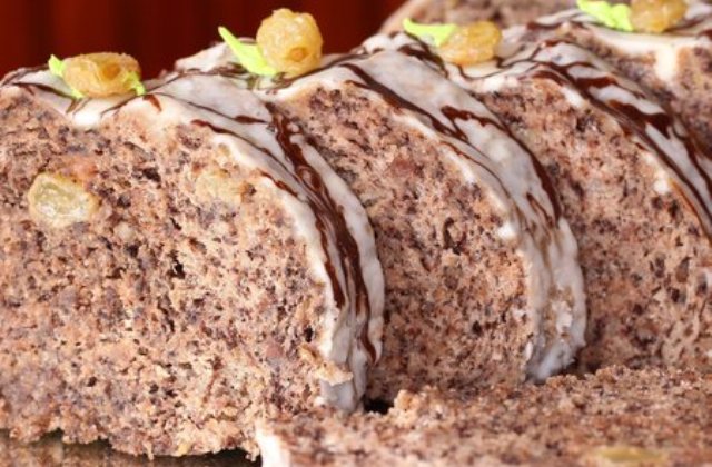A tojások sárgáját simára keverjük a cukorral és a darált mandulával. Hozzátesszük a reszelt csokoládét és a vörösborral meglocsolt zsemlemorzsát. Belekeverjük a mazsolát, egy kevés fahéjat, a törött szegfűszeget és a citrom reszelt héját. Végül 4 tojás keményre vert habját is beleforgatjuk. Kikent, kilisztezett formába öntjük. Előmelegített sütőbe egy edényben vizet teszünk, a süteményt is mellétesszük, és 45 percig sütjük gőzben. Ha elkészült, kifordítjuk a formából, és cukormázzal bevonjuk.