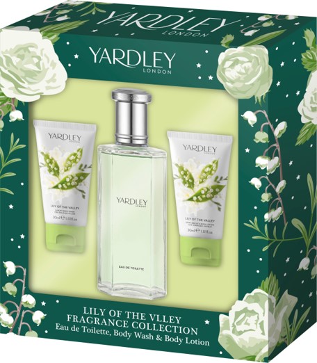 A Yardley London Lily of the Valley ajándékcsomagja egy 50ml-es edt-t, egy 30-es selymes testápolót és egy 30-es luxus tusfürdőt tartalmaz a gyöngyvirág illatkompozíciójában. A Lily of the Valley egy könnyed, nőies, fehér virágos illat, amelyben a gyöngyvirág és a frézia illatát az érett körte egészíti ki, és a pézsma meleg jegyei tesznek ellenállhatatlanná. Parabénmentes, 90%-ban természetes összetevőket tartalmaz.