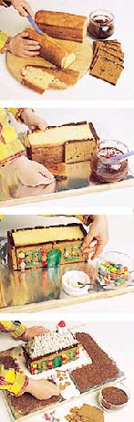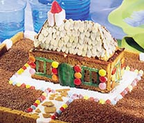 4. Elkészítjük a „tetőt”: a kúp alakú piskótát a házikó tetejére tesszük, és csokoládéval leöntjük (de vigyázzunk, a csokoládé ne folyjon le a ház „falára”!), és a mandulaforgácsokat egymásra téve, cserépszerűen befedjük. A „kéményhez” négyfelé vágott marcipánt teszünk a házikó tetejére, a közepébe pedig a zseléscukrot állítjuk. A házikó körül „kavicsos sétányt” csinálunk a kép szerint: fehér csokiforgácsot szórunk a tálcára, és a házikó elé piskótából „kavicsokat” rakunk.. A „sétány” széleit színes habcsókokkal díszítjük. A sétány körül szétszórjuk a csokidarát, a mézeskenyér szeleteiből és marcipándarabokból kerítést készítünk. Tálalásig hűtőbe tesszük.