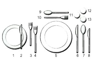 | 5. vacsora tányér 6. főétel kés | 7. leveses kanál 8. előétel kés |