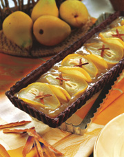 12×36 cm-es sütőformát sütőpapírral kibélelünk, majd a kakaós tésztát az aljára és az oldalára nyomkodjuk. A tészta alját villával megszurkáljuk, majd közepesen meleg sütőben aranyszínűre sütjük. Miután a tészta kihűlt, vízgőzben felolvasztott csokoládéval megkenjük, és 5 percre betesszük a hűtőbe szilárdulni. Ezután befedjük a körtepürével, és elrendezzük rajta a lecsöpögtetett körteszeleteket. Díszítésként a tetejére fahéjdarabkákat szórhatunk.