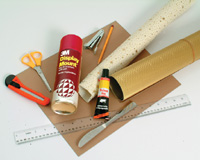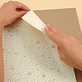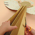 A vékony, aranycsillagpöttyös rostselymet 3M ragasztóspray-vel kasírozzuk fel a háromrétegű mikrohullámú kartonra. A mellékletben található szárnyformát rajzoljuk fel a karton hátuljára, és vágjuk ki sniccerrel. Ha a rostselyem felőli oldalon vágjuk körbe a mintát, óvatosan dolgozzunk, mert könnyen beszakadhat a vékony papír. A rostselyemből vágjunk ki egy borítóréteget a glóriának megfelelő formában, a 3M ragasztóspray-vel fújjuk le a hátoldalát, majd simítsuk a kartonra.