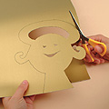 Az adventi Praktika mellékletben található vagy magunk rajzolta sablon alapján rajzoljuk az angyalka fejét az aranyszínű hullámkarton sima oldalára. Ügyeljünk arra, hogy a bordázat függőlegesen álljon. A fejet ollóval vágjuk ki, a belső részeket pedig sniccerrel, hogy pontosabb vonalakat kapjunk.