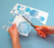Töltsük le a hópehelymintákat, de szerkeszthetünk magunk is hasonlókat. A kiválasztott motívumokról készítsünk nyomatot a HP nyomtatóhoz mellékelt HP Photo & Imaging segédprogram segítségével, a következő beállításokkal: a képbeállítás legyen tükrözött, a nyomtatási minőséget állítsuk a legjobbra, és a papírbeállításnál a felvasalható iron-on-transfert válasszuk. A képet tintasugaras nyomtatóval nyomtassuk a HP iron-on transfers² papírra. Vágjuk körbe a hópelyheket és a feliratokat.