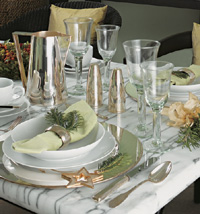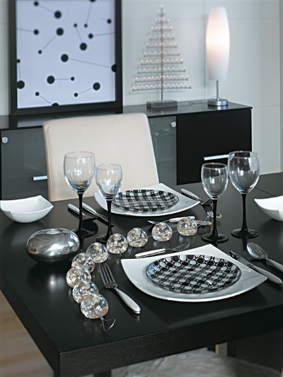 A hűvösen modern, minimalista stílusú enteriőrökben is teríthetünk az alkalomhoz illően. Ha a feketére pácolt fabútorokat fehér kiegészítőkkel párosítjuk, az a téli hóesést juttatja eszünkbe. Ráadásként karácsonyfa alakú égősor, ezüstszíné és üveg mécsestartók gondoskodnak az ünnepi hangulatról.