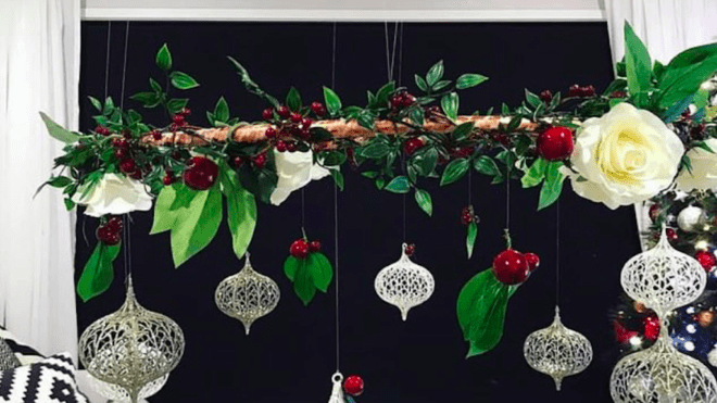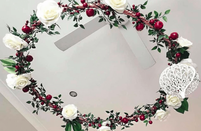 A hulahoppkarikát 5 dollárért vásárolta, a dekorzöldeket, virágokat és díszeket pedig az IKEA-ban szerezte be. Ezután szalaggal tekerte körbe a karikát, amire ragasztópisztollyal rögzítette a díszeket. Az ünnepi étkezőasztal fölé, vagy a nappaliba a legegyszerűbben halászzsineggel függeszthetjük fel.