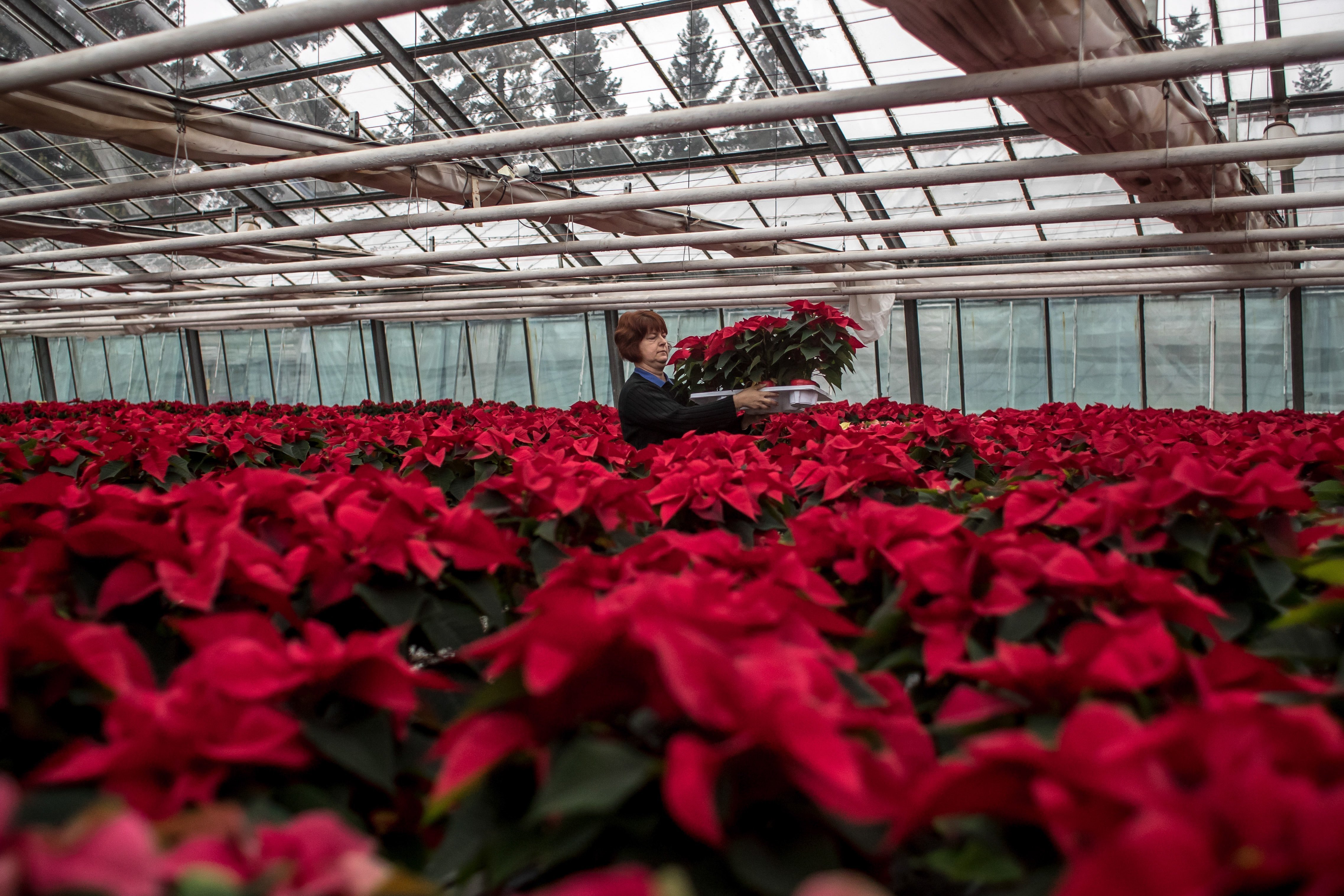 Mikulásvirágot (Euphorbia pulcherrima) gondoz egy cseh virágkertész a Silva Arauca dísznövény- és tájkertészeti kutatóintézet prágai melegházában 2018. november 22-én. A melegház a hetekben mintegy 15 ezer mikulásvirágot értékesít bolti kereskedelemben, mivel a cserepes szobanövény közkedvelt karácsonyi élõdísz a térségben (Fotó: MTI / EPA / Martin Divisek)