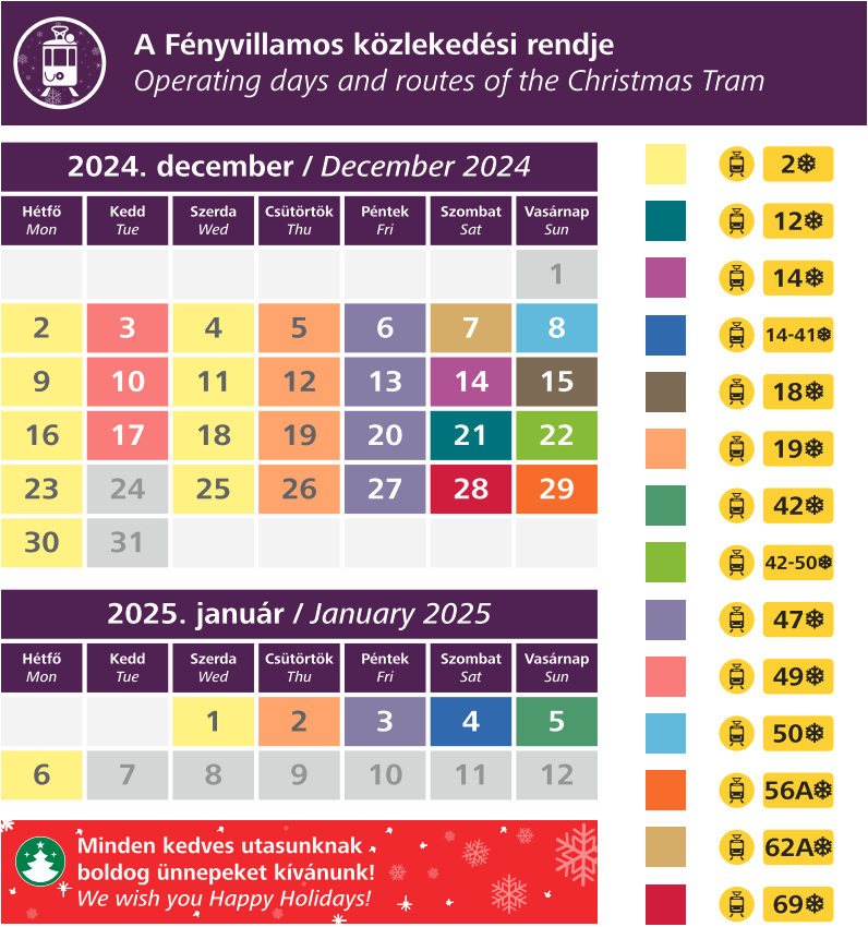 Ahogy 2009 óta minden évben, úgy idén is találkozhatunk Budapesten a Fényvillamosokkal az adventi-karácsonyi időszakban. A ragyogó, ünnepi díszbe öltöztetett szerelvények december 2-ától január 6-ig a késő délutáni, esti órákban közlekednek a főváros bel- és külvárosi kerülteiben egyaránt, a 2-es, a 12-es, a 14-es, a 14-41-es, a 19-es, a 42-es, a 42-50-es, a 47-es, a 49-es, az 50-es, az 56A, a 62A és a 69-es villamosok vonalán.