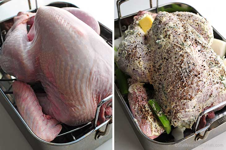 3) A pulykát sütőtálcára helyezzük. A majonézes keverékkel alaposan bedörzsöljük kívül és belül. Sózzuk és borsozzuk. A zeller- és hagymaszeletekből is teszünk a pulykára és a belsejébe is. A vajat a pulyka belsejébe tesszük.