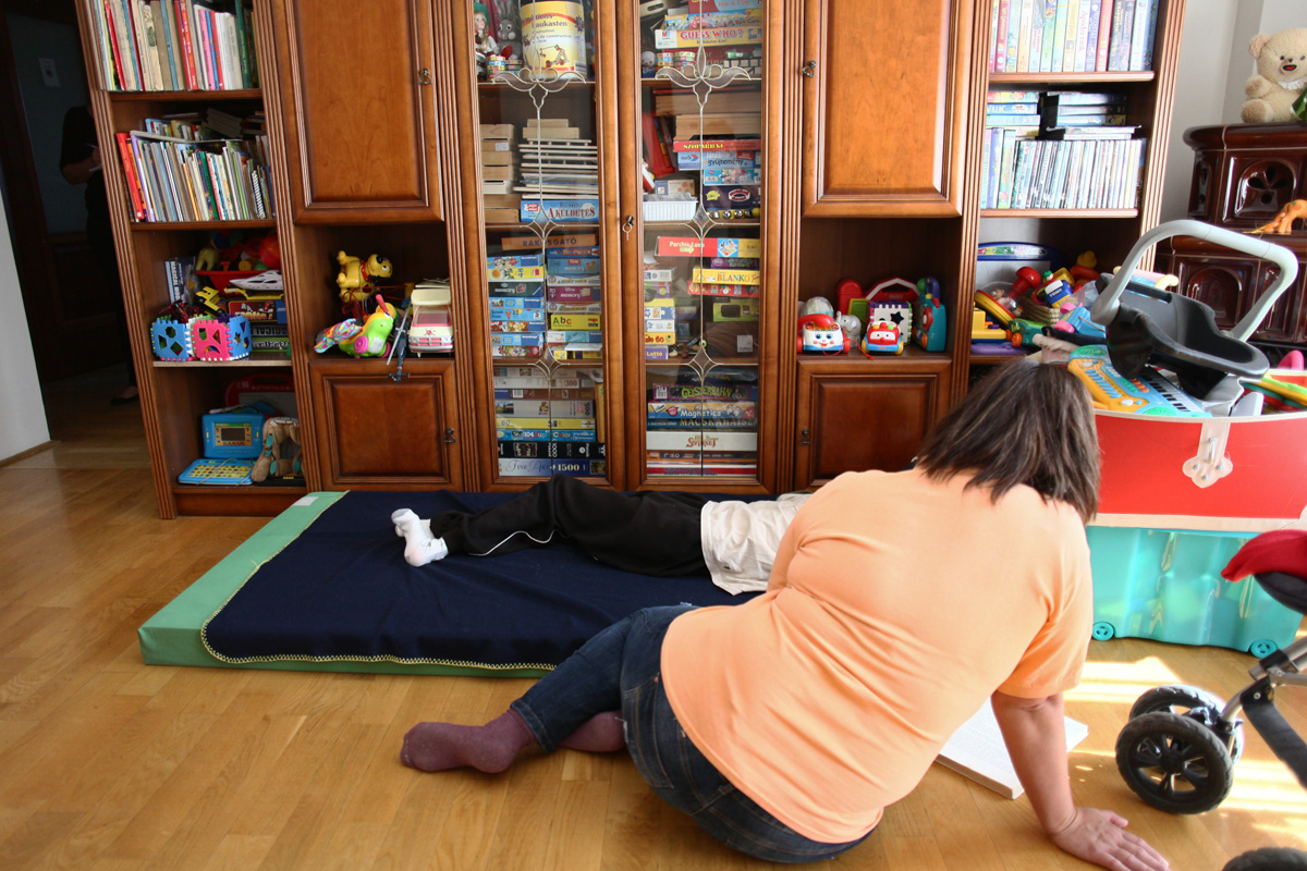 Törökbálint egyik kis utcájában járunk. Becsöngetünk egy szép, modern családi házba. Egy nővér mosolyogva nyit ajtót, később is a mosoly lesz a legmeghatározóbb élményünk. A nappaliban fekszik egy nagyfiú, mellette egy másik nővér térdel a szőnyegen, mesekönyvből olvas fel épp. Nem messze tőle, egy széken fiatal ápolónő ringat és csiklandoz egy kisbabát. Olyan az egész, mintha egy család életébe pillantanánk be.