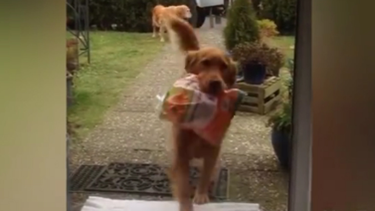 Bájos kutyasegítség a nagybevásárlás után – videó