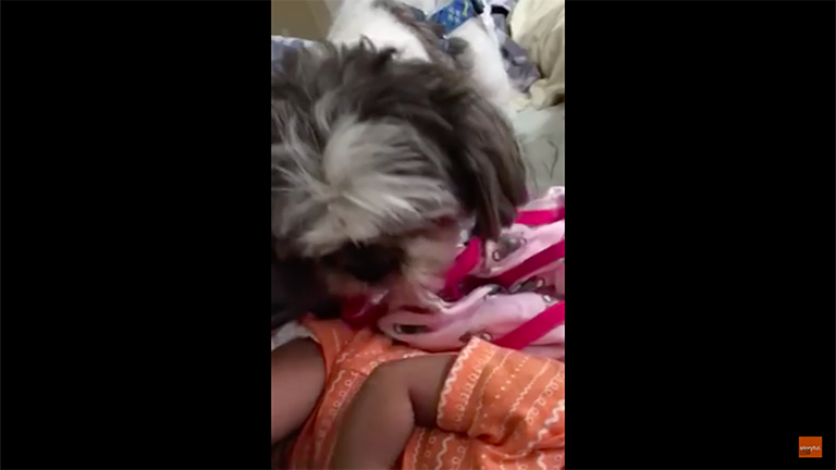 Tüneményes videó: kutya takargatja be a kisbabát