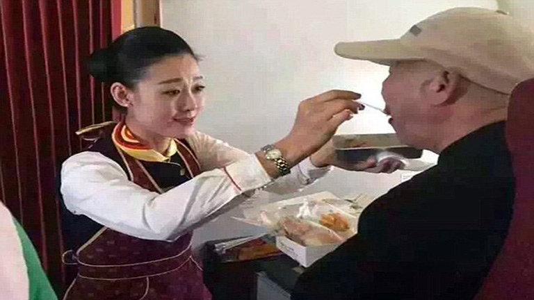 Megható fotó: idős férfit etetett a légiutaskísérő
