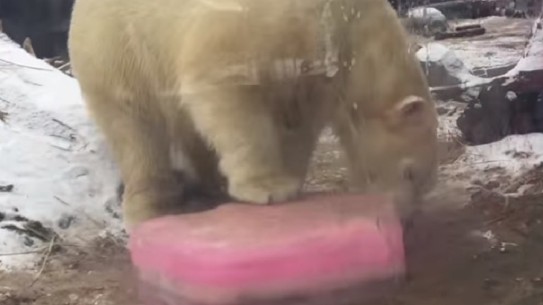 Szív alakú jeges finomságot kapott Valentin-napra a jegesmedve – videó