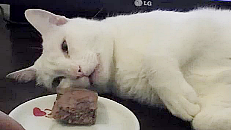 Elaludt evés közben a macska, de mégis az éhség győzött