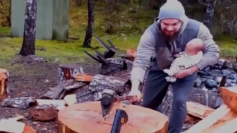 Újszülöttjével a karján vágja a fát ez az apuka – videó
