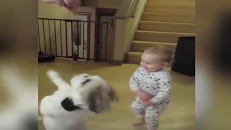 Kutyát utánoz a jutalomfalatra vágyó kisbaba – cuki videó