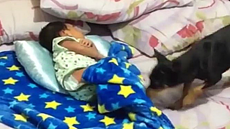 Ettől elolvadsz: így takarja be a kiskutya a pihenő babát