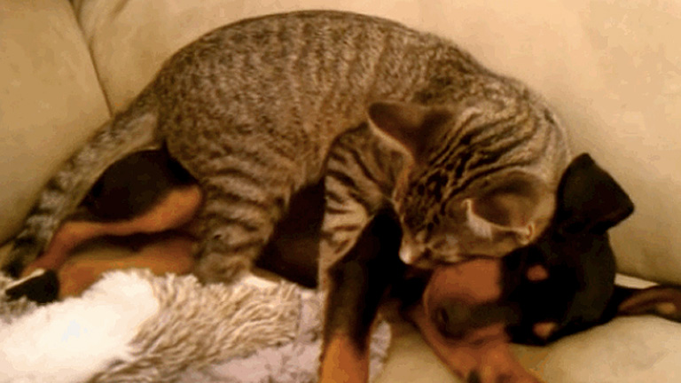 Tüneményes videó: így gondozza beteg kutyabarátját a macska