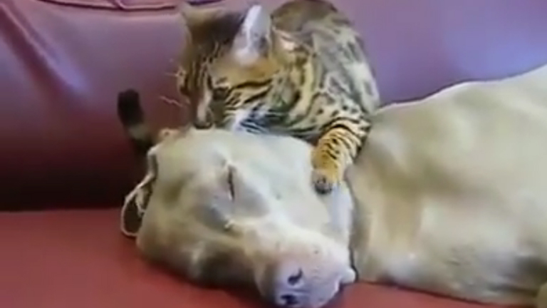 Elolvadsz: így masszírozza a cica a hatalmas kutyát