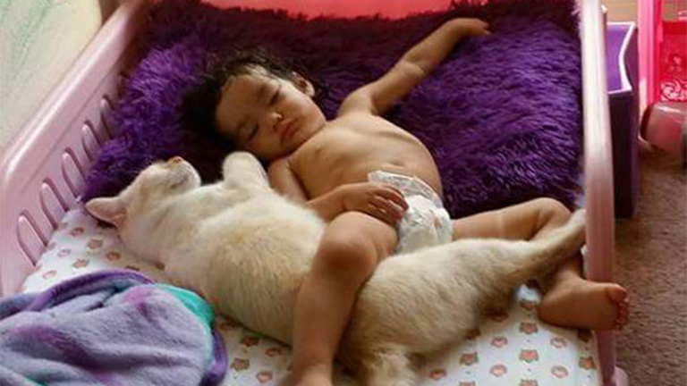 Találkozása első napjától együtt alszik a kislány és a cica