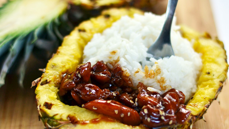 Teriyaki csirke rizzsel, ananászhajóban tálalva