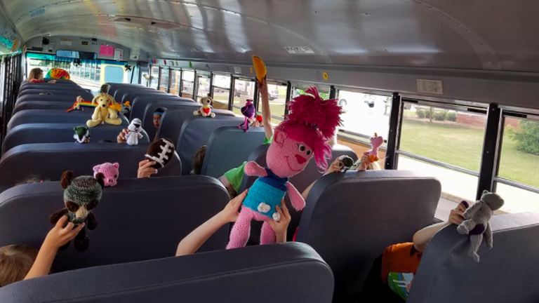 A buszsofőr minden gyereknek horgolt egy játékot az iskolabuszon