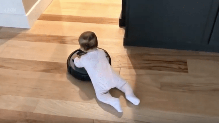 Cukiság: önműködő porszívóval száguldozik a bébi