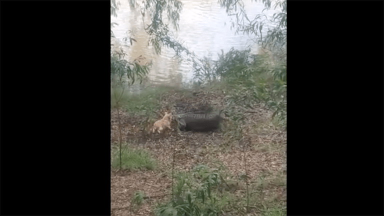 Simán elijesztette a krokodilt a pöttöm kutya – videó